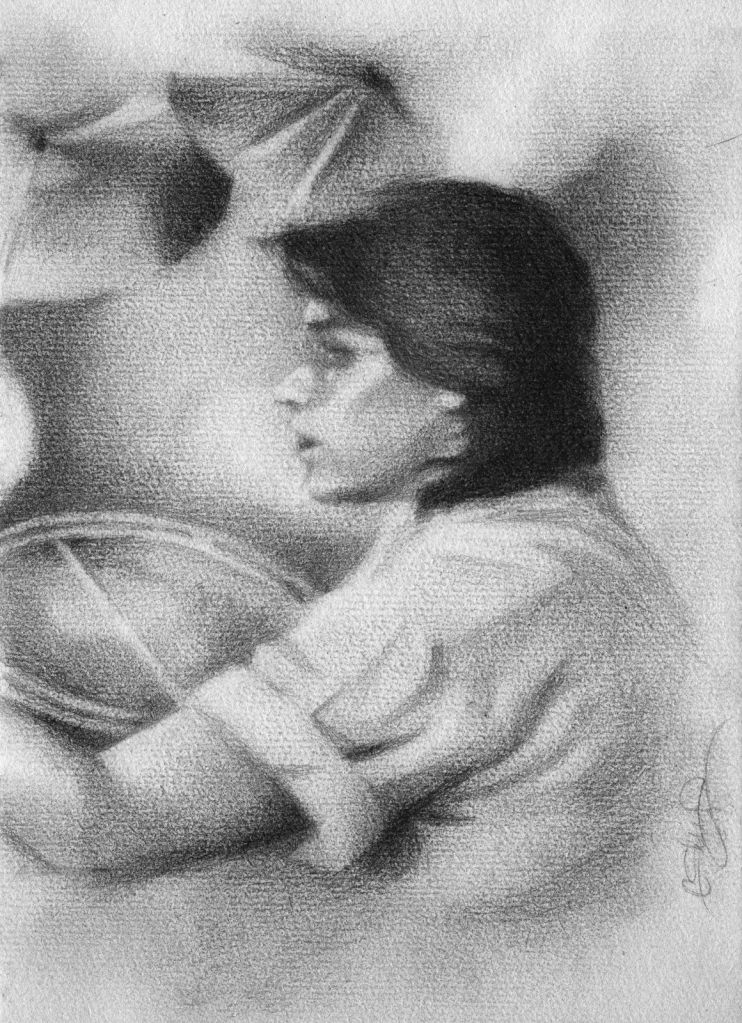 I wasn’t actually planning on blending this at all. It was just going to be a quick sketch. But somewhere along the way I realized there were no really clear lines in the reference picture that I could sketch from, so I started smudging everything with my finger. I ended up skipping over the outline aspect of the drawing, and just started putting in the shading as gradients and blocks of “color,” to create the form of the drawing.